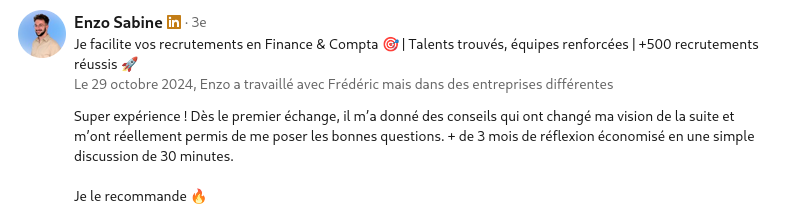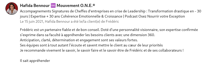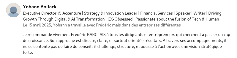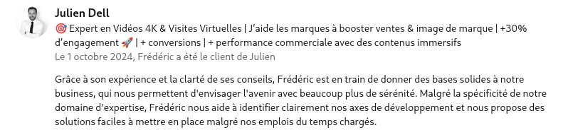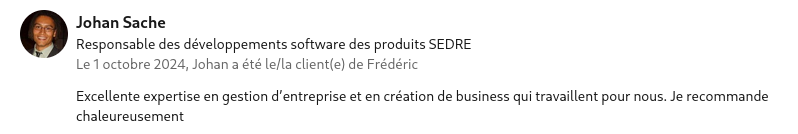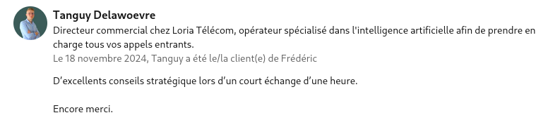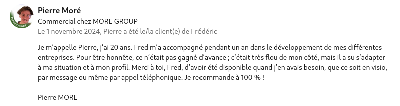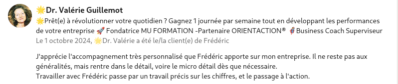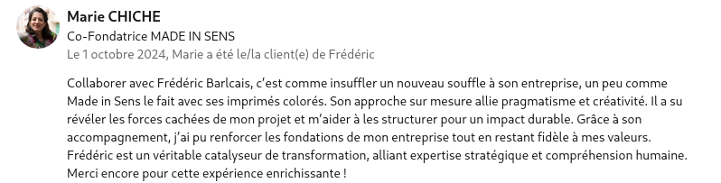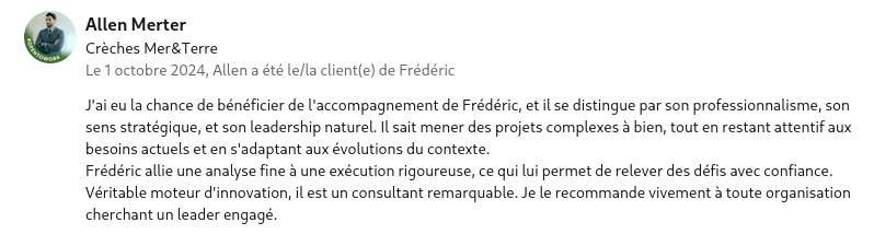 L’accompagnement de Frédéric lui a permis de structurer ses actions, s’entourer intelligemment, et bénéficier d’un cadre personnalisé pour son secteur.
