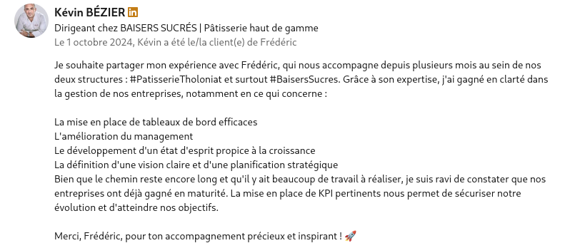 Avec l’aide de Frédéric, il a appris à structurer ses indicateurs, poser des objectifs financiers, et transformer sa passion en business rentable.