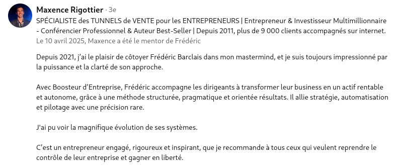 Avec le programme Booster d’Entreprise, il a appris à faire un vrai état des lieux, poser une trajectoire, structurer ses actions et profiter de l’intelligence collective du mastermind.